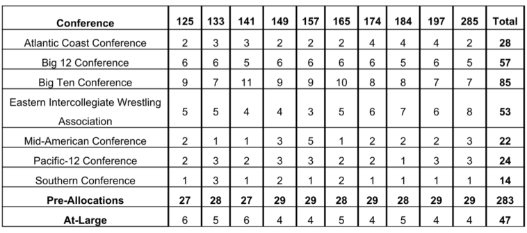 Each qualifying tournament was awarded pre-allocations to the national tournament based on regular season performance by conference wrestlers. Learn more about the pre-allocations here. The full chart of pre-allocations per conference is below.