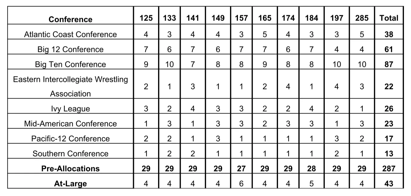 Each qualifying tournament was awarded pre-allocations to the national tournament based on regular season performance by conference wrestlers. The full chart of pre-allocations per conference is below.