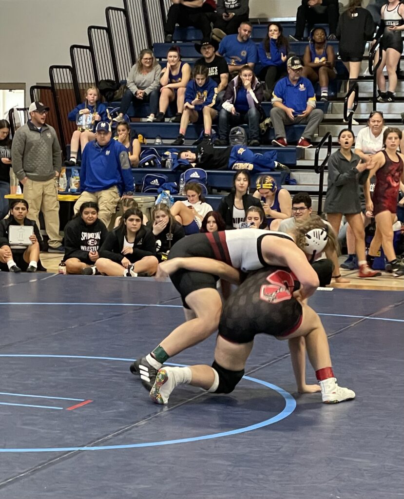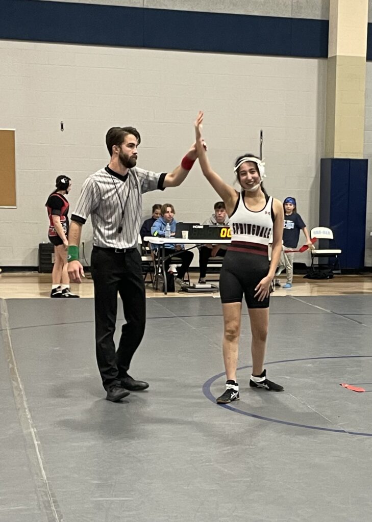 Although Coach Ashby does not come from a wrestling background, her daughter Emily has been competing for the girls’ team the past two years, so she has been a steady and positive presence at the competitions.
